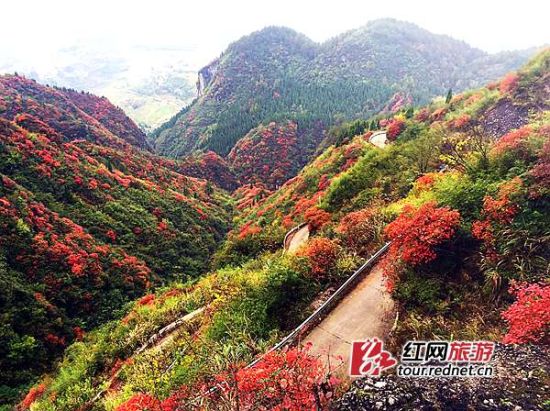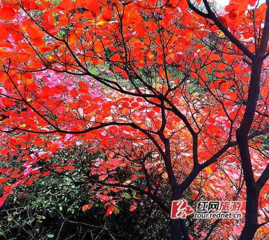 当地人介绍,红叶在张家界茅岩河两岸、崇山、泗水林场、猪石头林场等地都有生长,连绵50多公里。