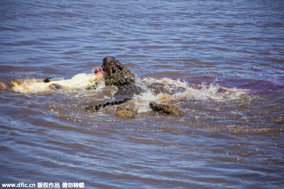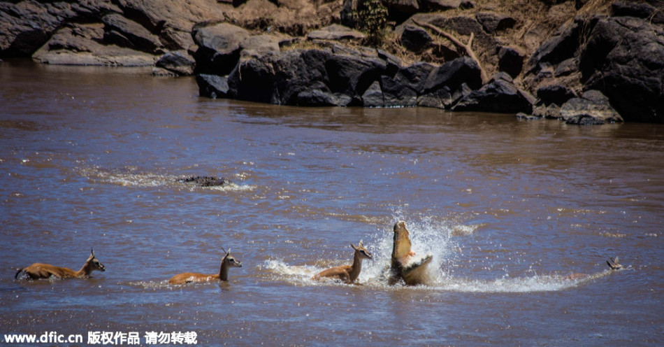 帕特里克说:“当时,我们离羚羊群只有27米到45米左右。这群羚羊开始过河,突然远处游来一只鳄鱼。在咬住其中一只羚羊后,鳄鱼用翻滚的方法将猎物拖入水下。整个捕猎过程只有几分钟,之后水面上又回归平静,像什么都没发生过一样。”