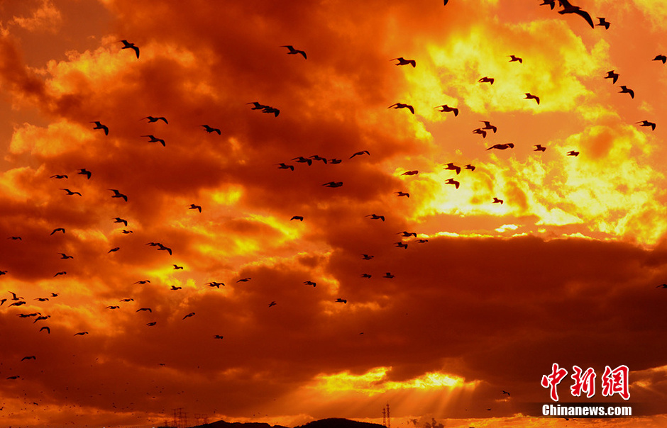 日前,辽宁大连甘井子区拉树房附近的天空出现火烧云,海鸥等禽鸟在天空飞翔,绚丽的风景让人仿佛置身于漫画场景中。
