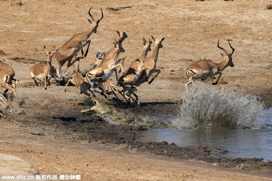 在大自然里就连喝水也得保持高度警惕才行。一群黑羚羊在水塘边喝水,一头已经一个月没吃到东西的鳄鱼偷偷靠近这群羚羊,当它浮出水面,大口张向羚羊的那一刻,一只羚羊甚至被吓得弹到了空中。