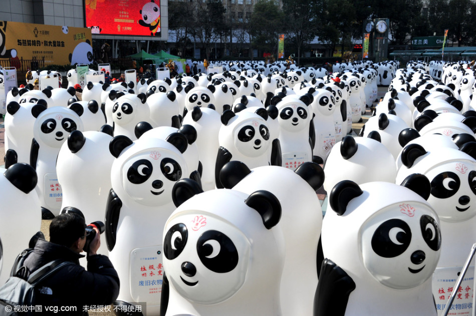 1月8日,800只憨态可掬的大熊猫回收箱展现在南京路步行街和淮海公园,市民们只需动动手,就能和可爱的大熊猫亲密接触,还能拿家中的旧衣物来进行“喂食”。
