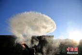 面对今年冬天最强的寒流,冰城市民玩起泼水成冰的游戏。有市民利用大杯子把热水扬到空中,在泼出的瞬间,水迅速结冰,在空中形成美丽的冰链。