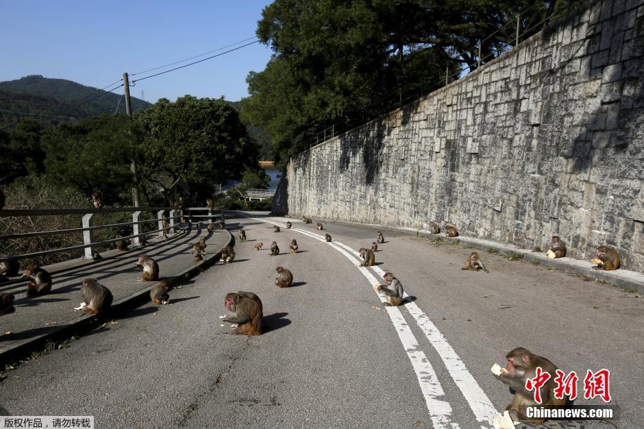 日前,在香港的郊野公园内,猴子们成群结队的来到大马路上,吃路上残余的面包片,并享受阳光。