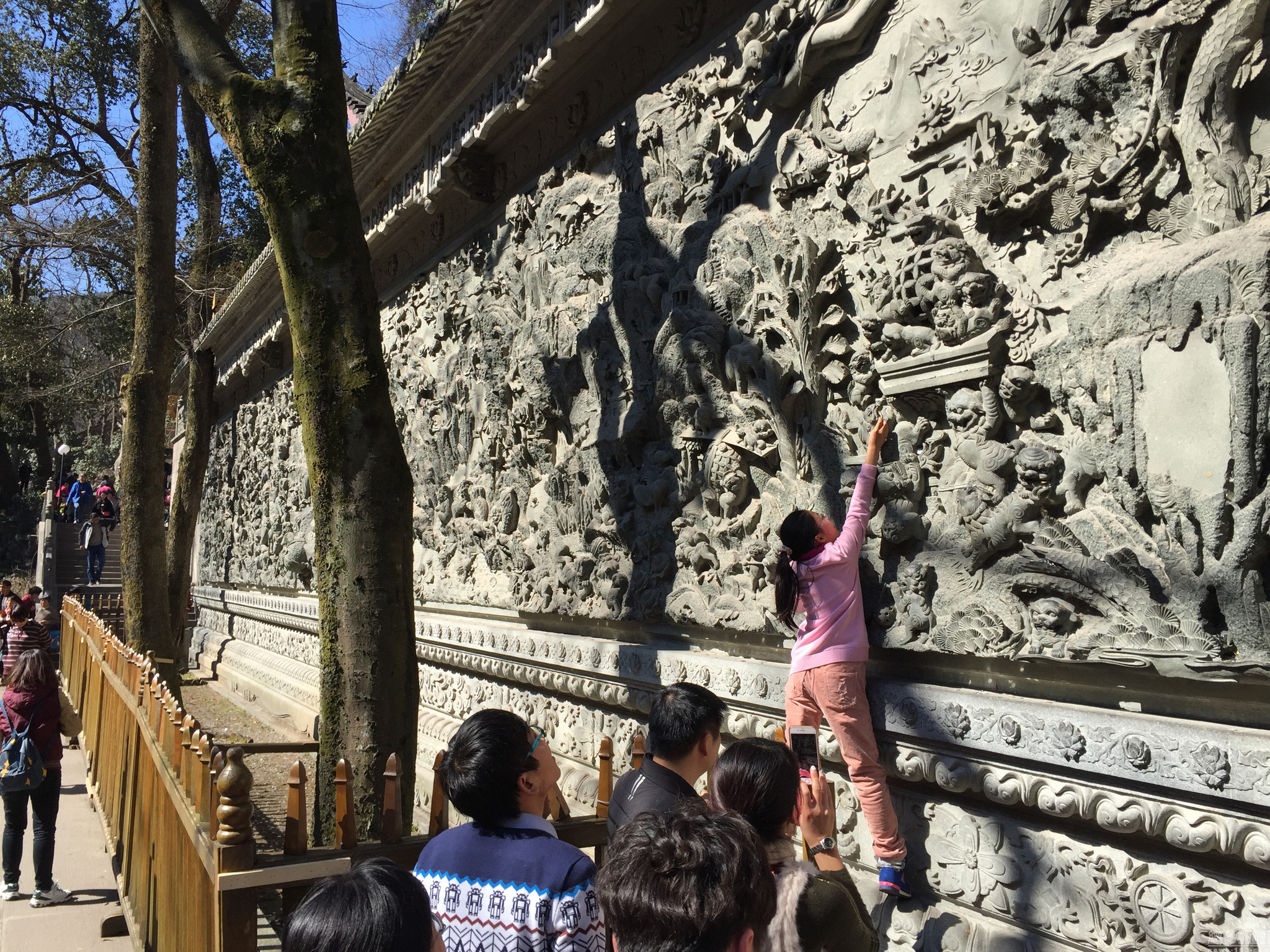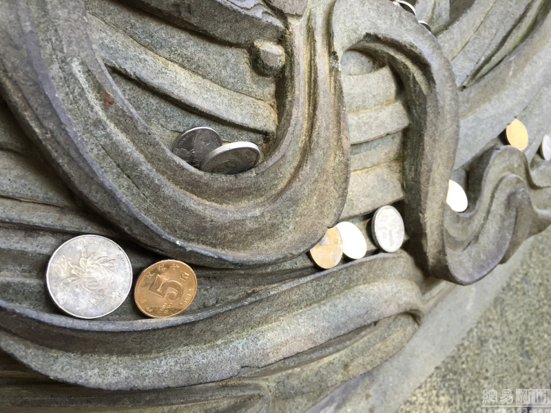 日前,浙江省杭州市,大批游客前往全国著名古寺灵隐寺祈福,纷纷向一面雕刻有图案的墙体上投掷硬币,墙壁成“硬币墙”。