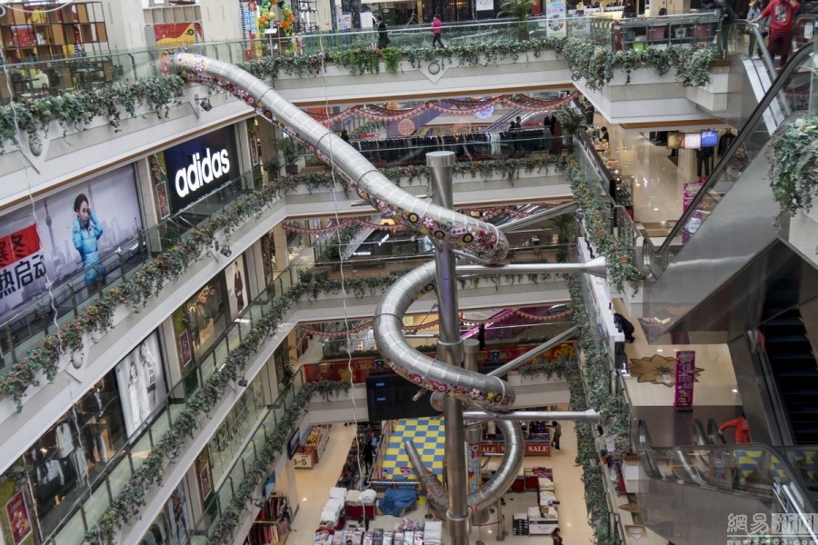 近日,上海浦东新区浦建路一商场中庭内出现一巨型滑梯。这座滑梯使用不锈钢结构制作,从最高5层处盘旋而下,一直可以滑到一层,中间蜿蜒弯曲,从侧面看好似龙形。