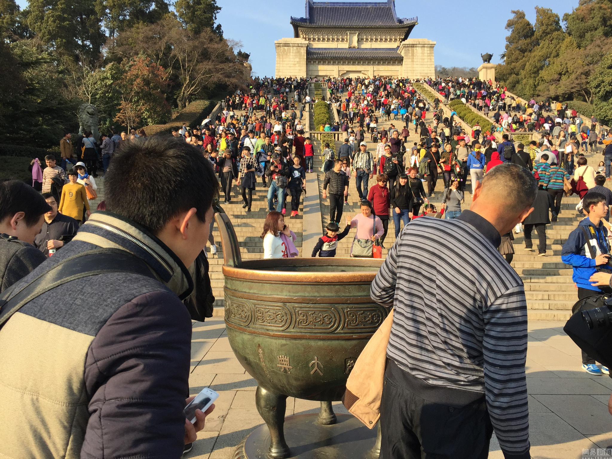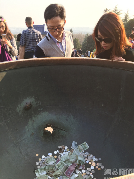 日前,江苏省南京市,日本侵略中国的证据——南京中山陵铜鼎破损处被游客摸得发亮,甚至还有不少游客向铜鼎内投掷钱币祈福。