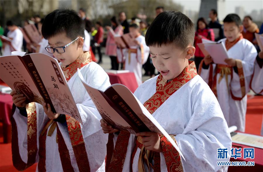 日前,一场汉服开笔礼仪式在西安汉城湖举行,来自西安多个学校的55名儿童身着汉服、行汉礼、写汉字,在老师的带领下通过“朱砂开智”“击鼓鸣智”“启蒙描红”等9个步骤体验中国古代传统文化。