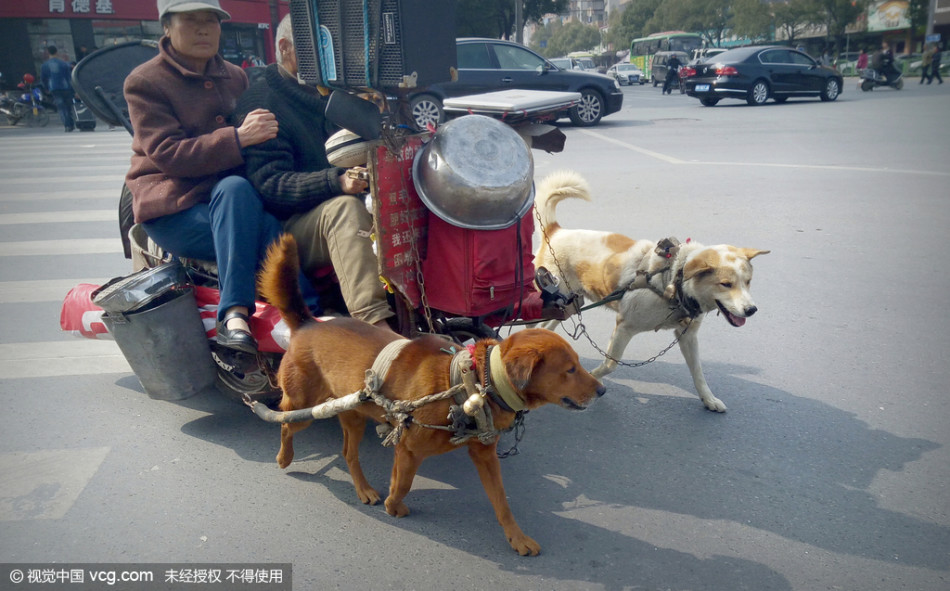 日前,在浙江义乌繁华的闹市区,一对老年夫妇驾驶一辆自行改装的狗拉车,闲庭信步一般地在街道上行驶。