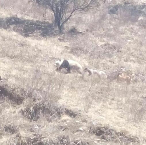 当时,大熊猫被身后几只狗一路追赶,往山坡上跑去。村民们赶紧跑上山坡,将几只狗撵走,并及时告知了南箐乡护林员曲木沙机。