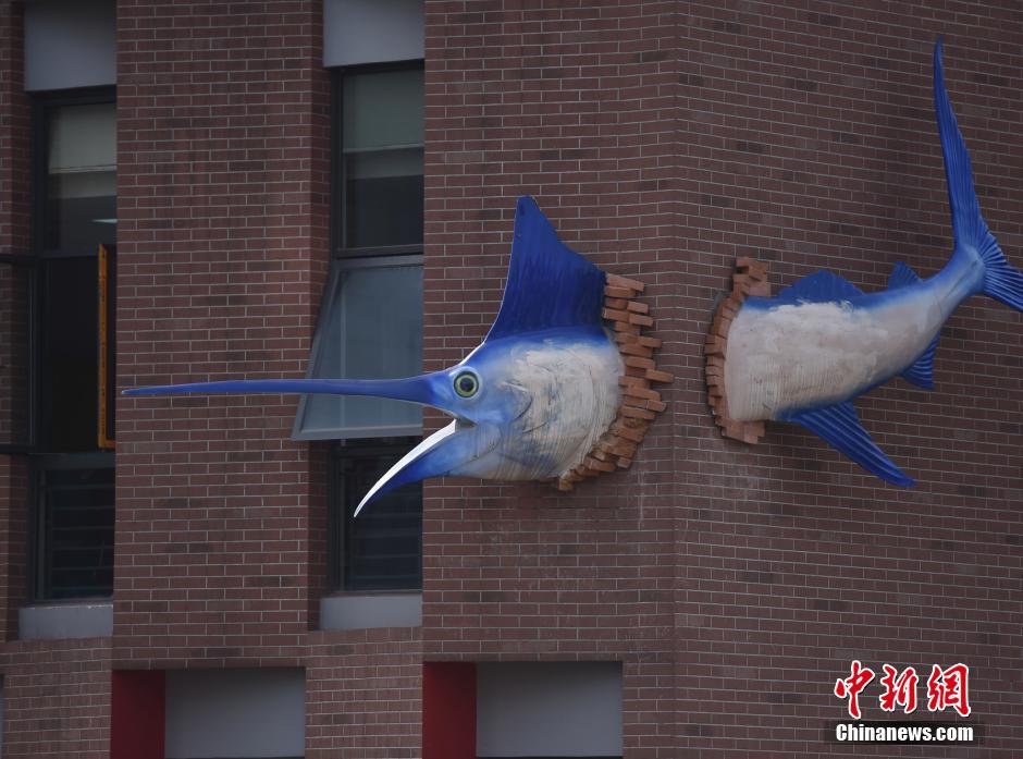 日前,在重庆一建筑大楼外墙上,身长3米的“剑鱼”雕塑穿墙而过,鱼身两端悬在半空中。