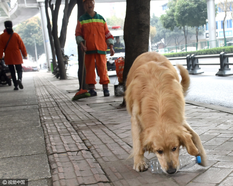 金毛狗狗娇妹一旦瞧见矿泉水瓶,金毛就扑过去,叼起瓶子后,跑回环卫工身边邀功……