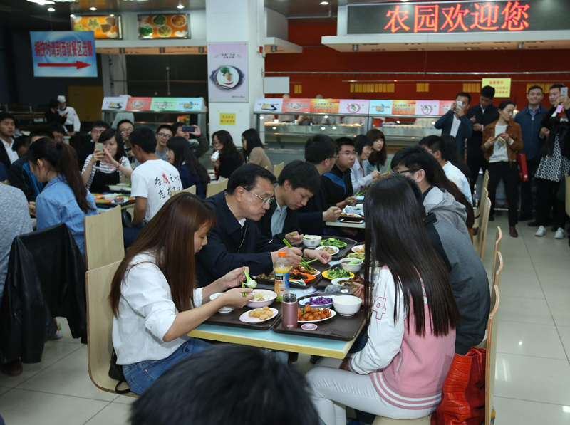 当李克强端着餐盘选好菜后坐到学生中间,学生们热烈欢迎,都兴奋的和总理聊天,从食堂菜价贵不贵到国家助学金够不够用,从宿舍住宿条件到同学们的论文选题,总理兴致勃勃与大家边吃边聊了半个多小时。