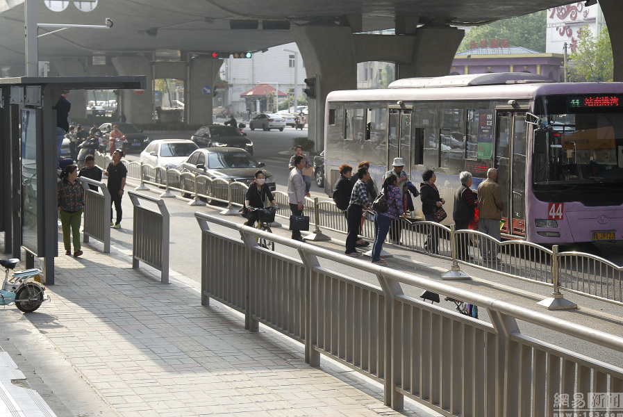 日前,河南省郑州市陇海路一处公交站台前,新设的交通护栏将靠站的公交车与候车站台隔离,乘客需翻越齐腰高的栏杆才能上车。
