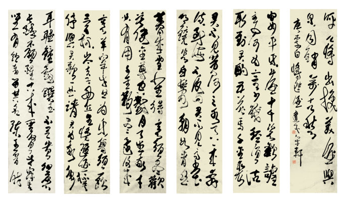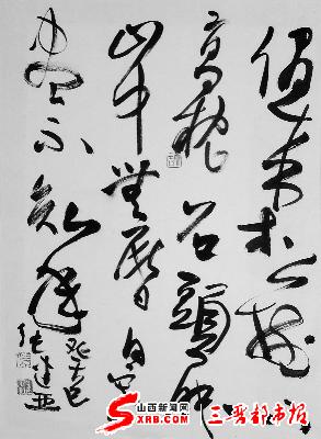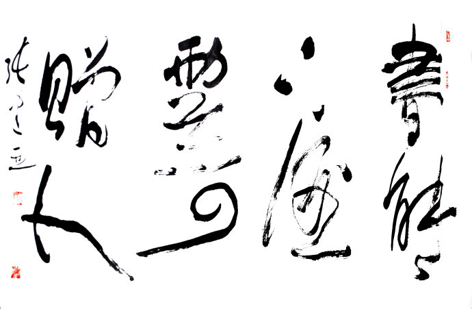 林鹏先生云:“尤其狂草,飘逸跌宕,特立孤行,有龙腾虎跃之妙、崩崖坠石之奇,因而它同其它书法艺术相比,最见功夫,最见性情,最适合表现性格,最容易流露人的思想情绪,最能反映出作者的文化素养和艺术造诣。”张建亚谨遵先生教导,能从贤者游,勤于读书,不耻下问,这就使他的书法既具有洒脱豪迈的气象,又有清健儒雅的品格。林鹏先生接受了傅山的草书中“断续团圆构,丫权艾纳松”“回顾奔驰兽,旋骇竹术龙”的艺术风格,故而师从林鹏先生的张建亚,草书既有张旭、怀素的大气磅礴,又有傅山的连绵不断,其浩然之气跃然纸上。