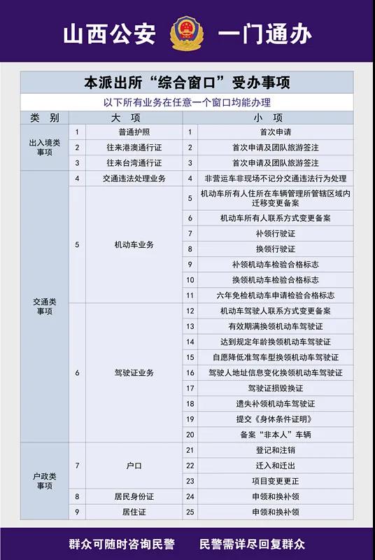 3月12日,山西省公安厅举行新闻发布会,向社会各界通报:山西公安派出所“一门通办”综合服务将于3月13日正式启动,全省的1325个派出所都可以办理治安管理和交管业务,其中439个派出所同时可以办理出入境业务。当前,国内疫情防控形势持续向好,但形势依然复杂,随着企业复工复产,广大人民群众到公安机关办理业务的需要逐步增加。为防止人员聚集,山西公安机关进一步优化“一网通办”线上服务,群众可“不见面”线上办理公安业务。同时,为满足群众线下办理业务的需求,山西公安机关在全省所有户籍派出所启动出入境、交管、户政“一门通办”综合业务,方便群众在家门口办理公安政务业务,又对人员进行了分散稀释。山西是公安部公安政务服务“一门通办”试点省市之一。派出所“一门通办”综合业务启动后,群众可以在全省公安机关所有户籍派出所无差别办理出入境、交管、户政27项业务,其中包括普通护照首次申请和来往港澳通行证、来往台湾通行证首次申请及团队旅游签注5项业务;交通类补换领行驶证、补换领机动车检验合格标志、非营运车非现场不计分交通违法行为处理等8项机动车业务和机动车驾驶人联系方式变更备案、有效期满换领机动车驾驶证、驾驶证损毁换证等9项业务;户政类户口、居民身份证、居住证5项业务。山西公安的“一门通办”举措真正让群众和企业到公安机关办事不找警种、不分区域、一次办成、全省通办,做到“只进一个门、办结所有事”。山西公安派出所“一门通办”综合业务有以下几个特点: