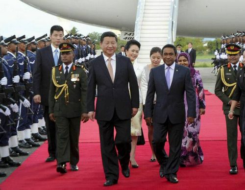 习近平和彭丽媛离开机场时,当地民众载歌载舞,挥舞两国国旗,手举标语牌,上面用中英文和当地迪维希文书写:“感谢中国”、“加强中马关系,筑造友谊桥梁”、“中马是共同发展的伙伴”、“海上丝绸之路,全亚洲的梦想”。习近平和彭丽媛走到他们面前,挥手致意,马尔代夫青年身着盛装,按当地习俗将花瓣撒满红地毯,欢迎尊贵的客人。两国元首夫妇在机场所在岛屿码头道别,习近平和彭丽媛乘船前往下榻宾馆。