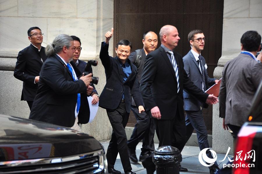 马云向媒体记者竖起拇指 人民网纽约郭艺萌 摄