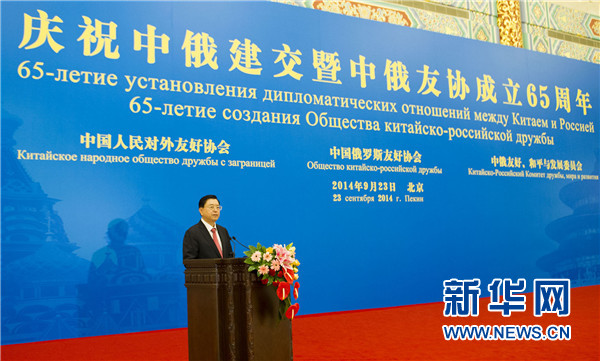 新华网北京9月24日电(记者熊争艳)中俄建交65周年暨中俄友协成立65周年招待会23日在人民大会堂举行。全国人大常委会委员长张德江与俄罗斯联邦委员会主席马特维延科出席招待会并致辞。