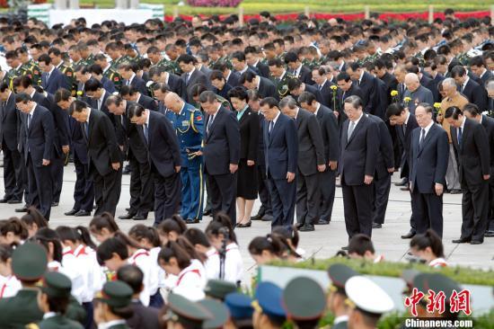 9月30日是中国设立的首个烈士纪念日。上午,习近平、李克强、张德江、俞正声、刘云山、王岐山、张高丽等领导人来到北京天安门广场,与首都各界代表一起,出席向人民英雄敬献花篮仪式。中新社发 盛佳鹏 摄
