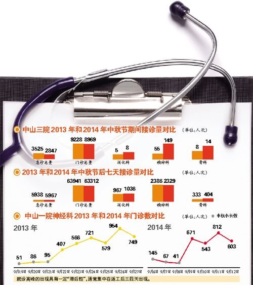 每年中秋节到国庆节前后,是“节日病”的集中暴发时段,医院承受的接诊压力也最为巨大。记者选取中山大学附属第一医院和中山大学附属第三医院近两年中秋节前后的接诊情况进行分析。数据显示,“节日病”初次就诊潮往往出现在假期中段,而真正的“高峰”则要推迟到假期结束后三四天才出现。专家提醒,如果轻症患者病情没有迅速变化,不妨避“峰”就诊。